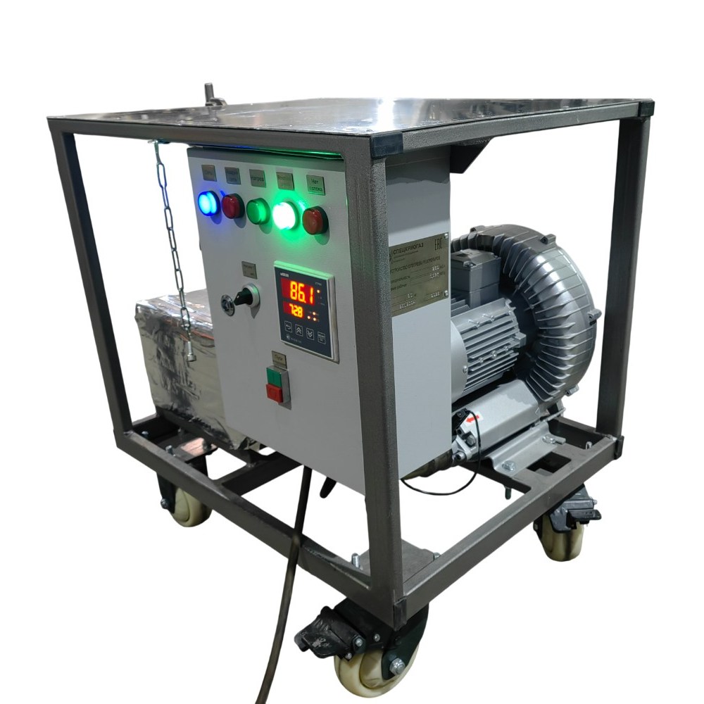 Принцип действия принудительный: вентилятор высокого давления мощностью 2.2 кВт нагнетает воздух через фильтрующий элемент, исключающий попадание мельчайших частиц в полости криогенной арматуры. Присутствует вариативность подачи: оператор может установить минимальный расход 50 м³/час для медленного отогрева аппаратуры или выставить мощность на максимум 250 м³/ч к примеру для размораживания днища резервуара. Жаростойкий нагреватель обеспечивает стабильные 300°C независимо от температуры окружающей среды. Питание осуществляется от трехфазной сети 380 В, управление УОР-1 осуществляется через приборную панель шкафа.